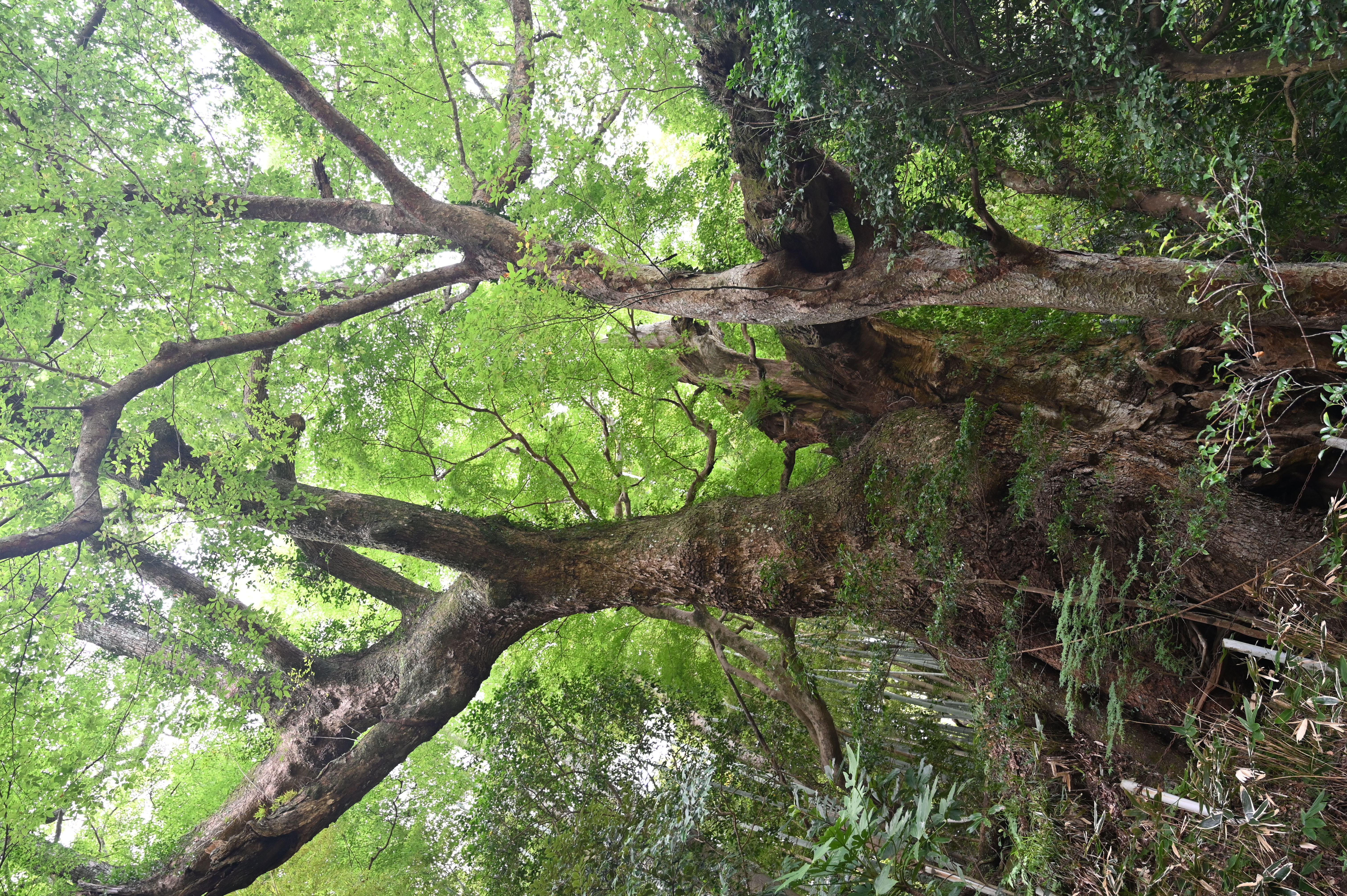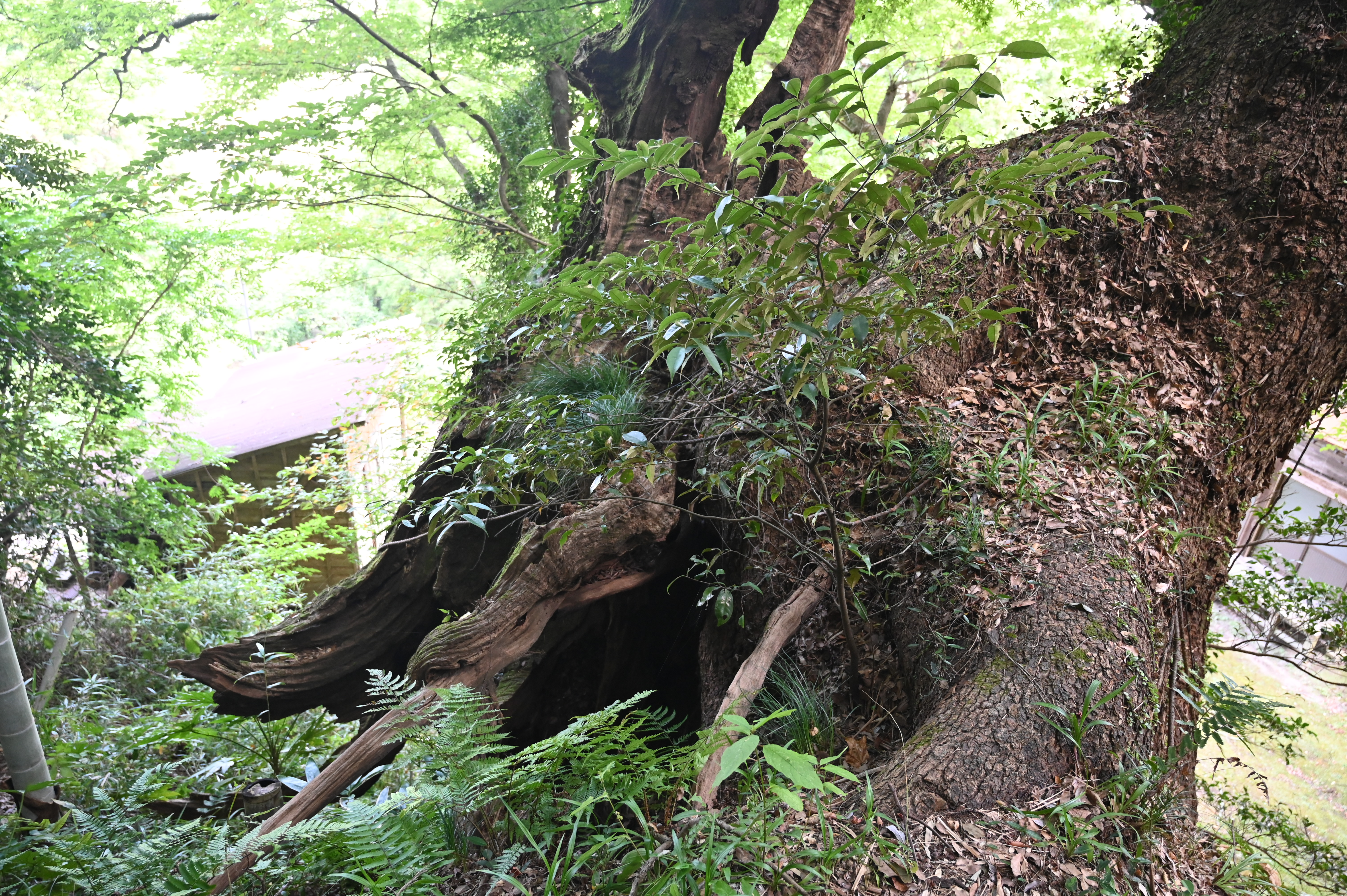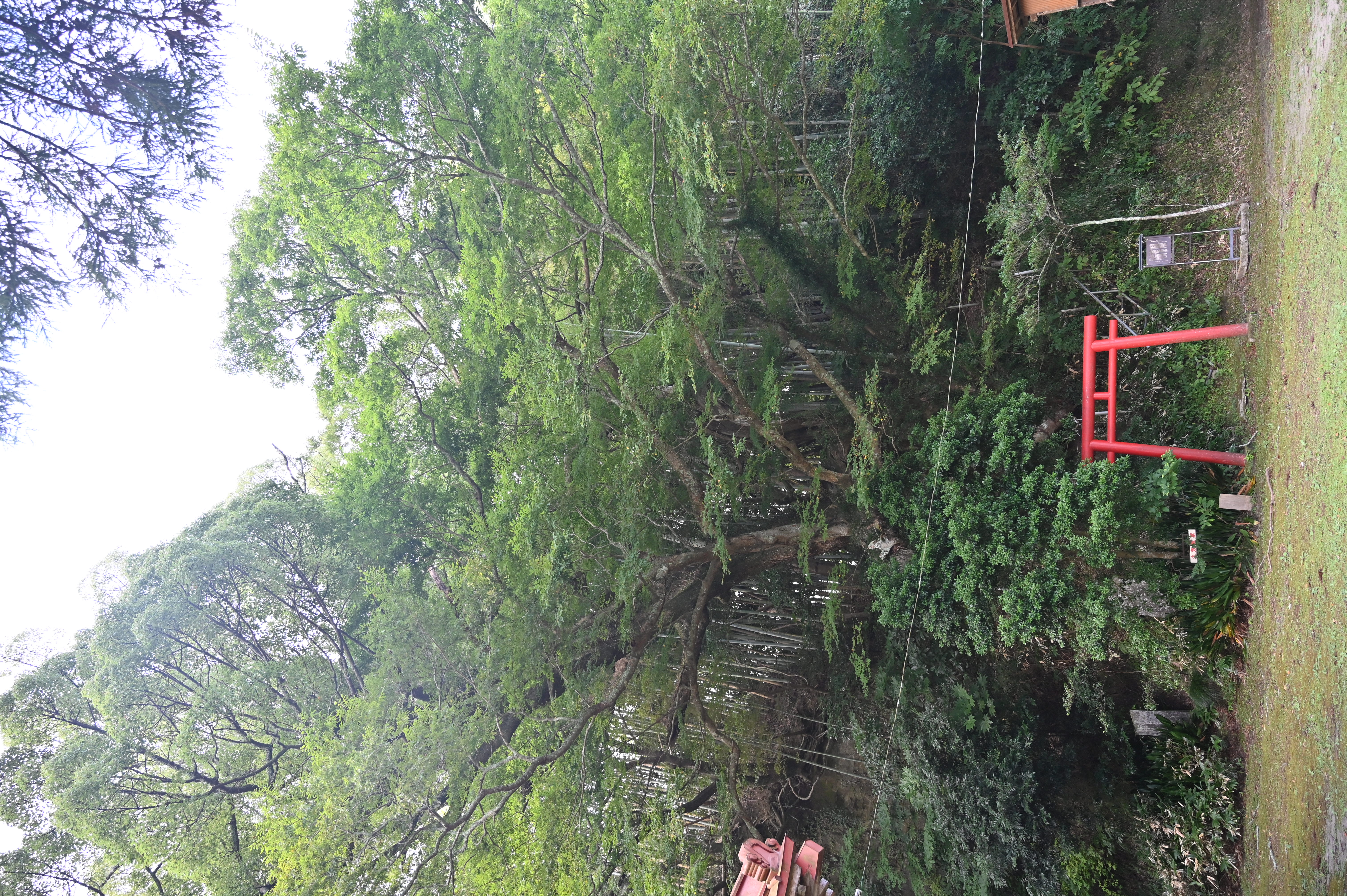 睦沢地区南の山すそ、諏訪神社の社殿横手の斜面に立つ同社の御神木。非常に古めかしいクスの老巨樹で、千葉県内では富津市の「環の大クス」に次ぐものであろう。クスノキのすぐ下には赤い鳥居が建てられ、昔からの信仰が伺われる。本樹も主幹はすでに失われ、その外郭から出た大枝数本で樹冠を展開。現在、樹勢はおおむね安定しているようだが、山側の根が枯れて浮き上がっており、先行き倒壊が心配される。