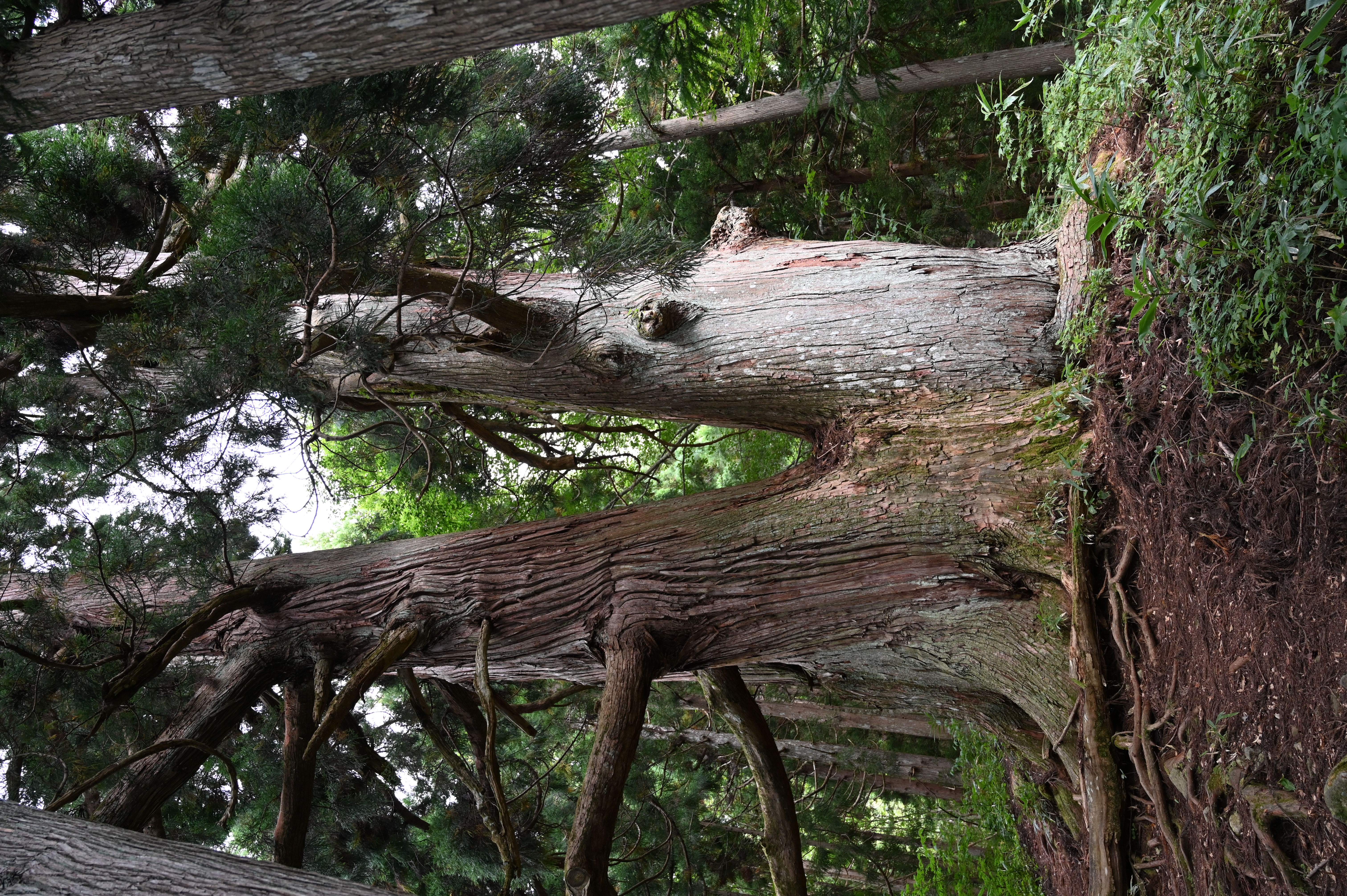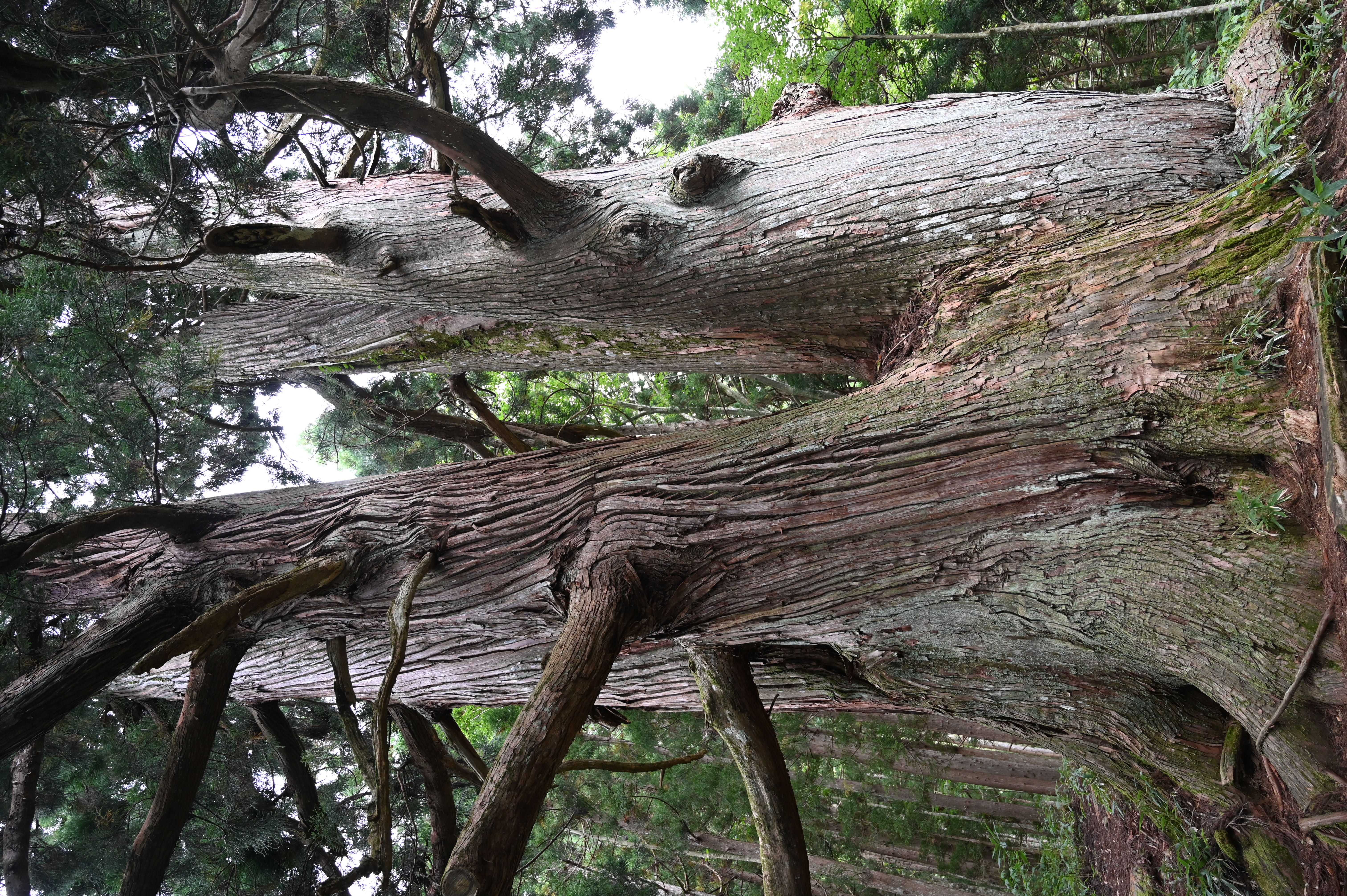 石徹白の白山中居神社から背後の山を少し上った尾根筋に立っている。三株の合体木とみられ、接近して植えられた杉苗が大きくなり今見る姿を成したものであろう。背面にまわると接合部分が露わに見えている。一幹一幹はまだ若々しく、目立った損傷もなく樹勢良好。樹齢は300年内外と見たが、してみると伝えにある江戸中期の僧・浄安が目印に植えたものか、あるいはその墓標として植えられたものかもしれない。