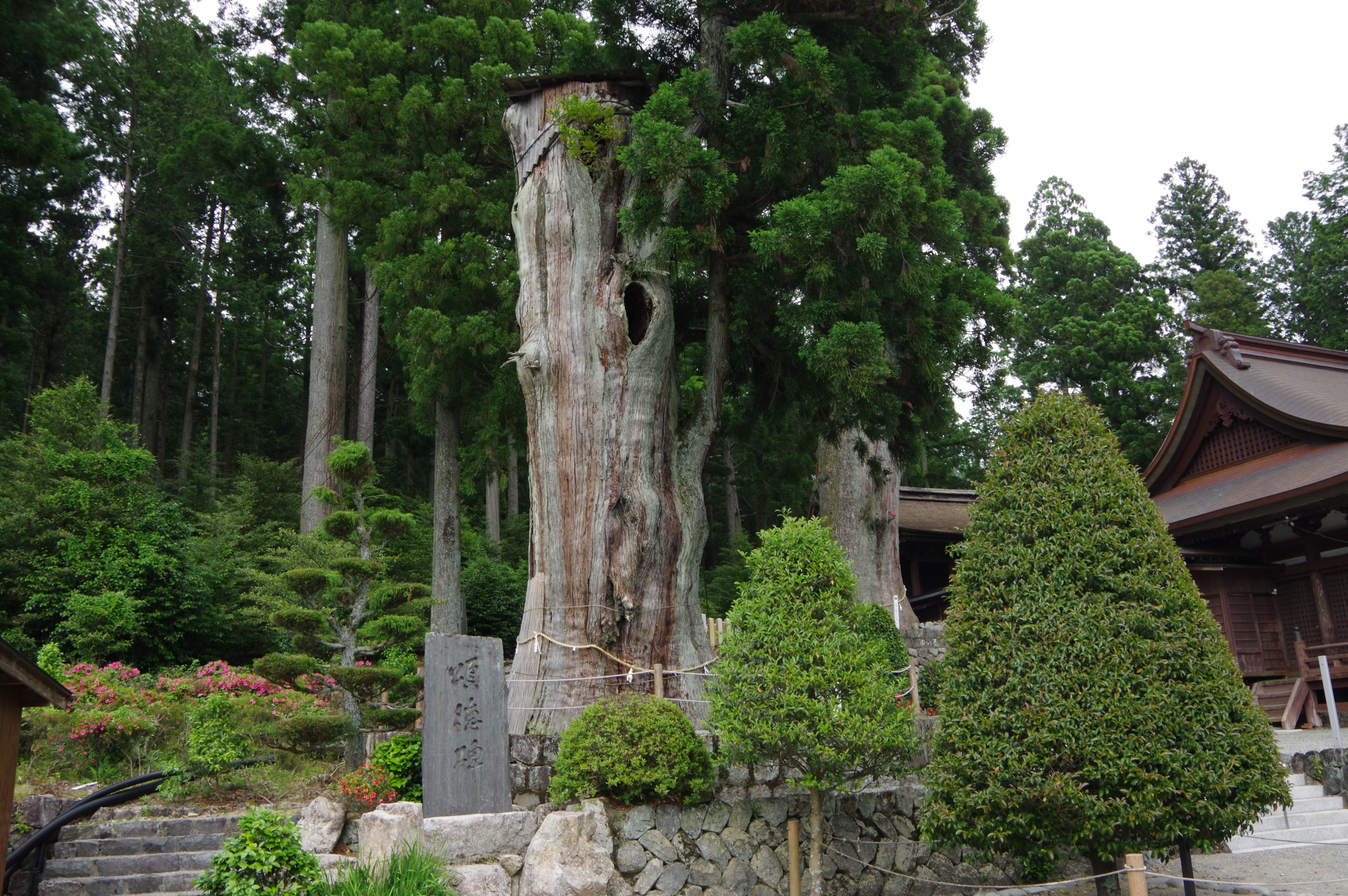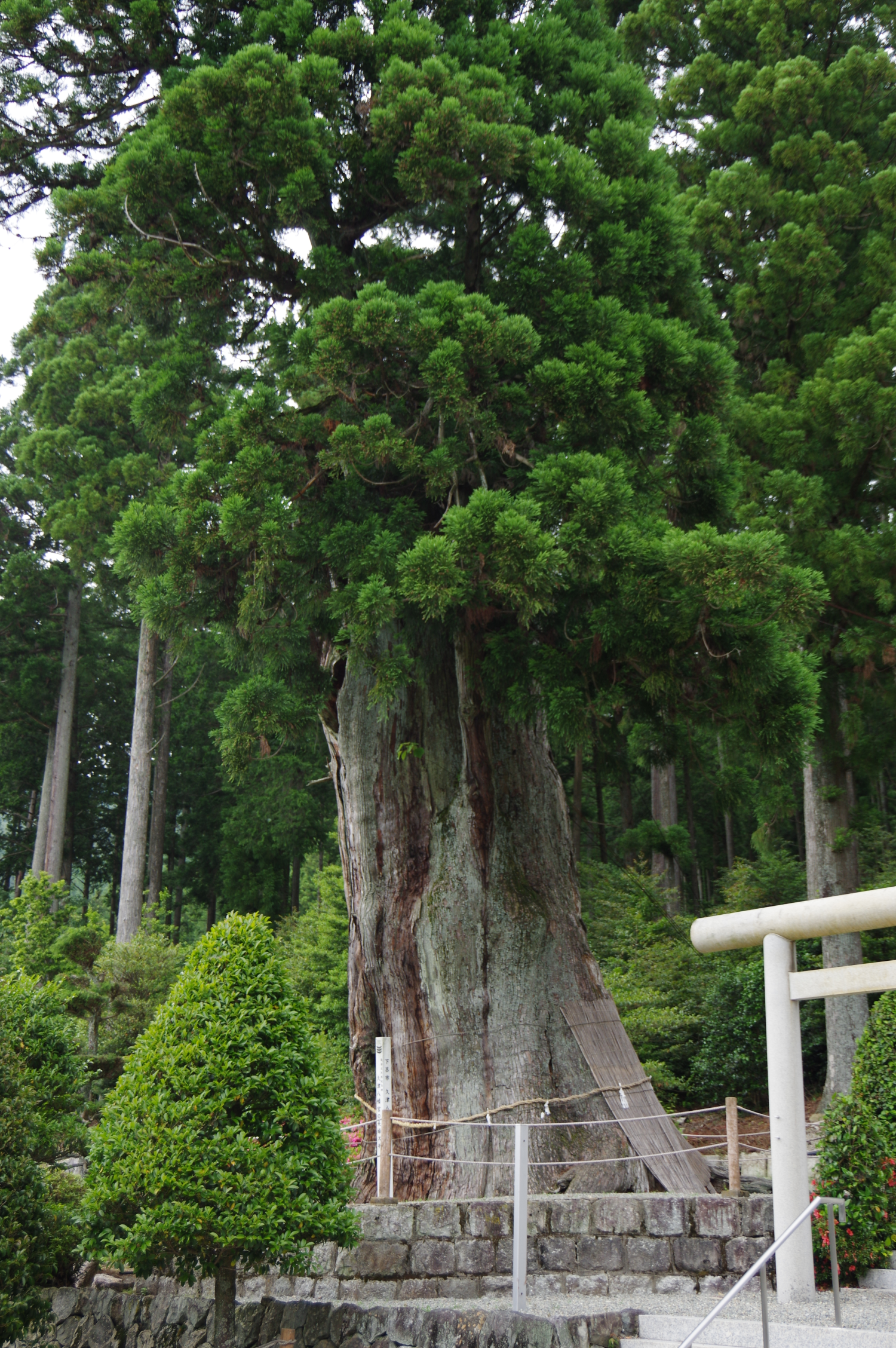 夫婦スギのうち、神社入口付近に立つ方。昭和34年の伊勢湾台風はじめ幾多の暴風により、地上10mを超えたあたりで主幹が失われ、非常に弱っている。巨大な幹だけが目立つ姿は一見、手足をもがれた達磨のよう。ただそれを補うように側枝が成長して伸びてきており、十年程前に比べると樹勢はやや持ち直しつつあるようにみえる。