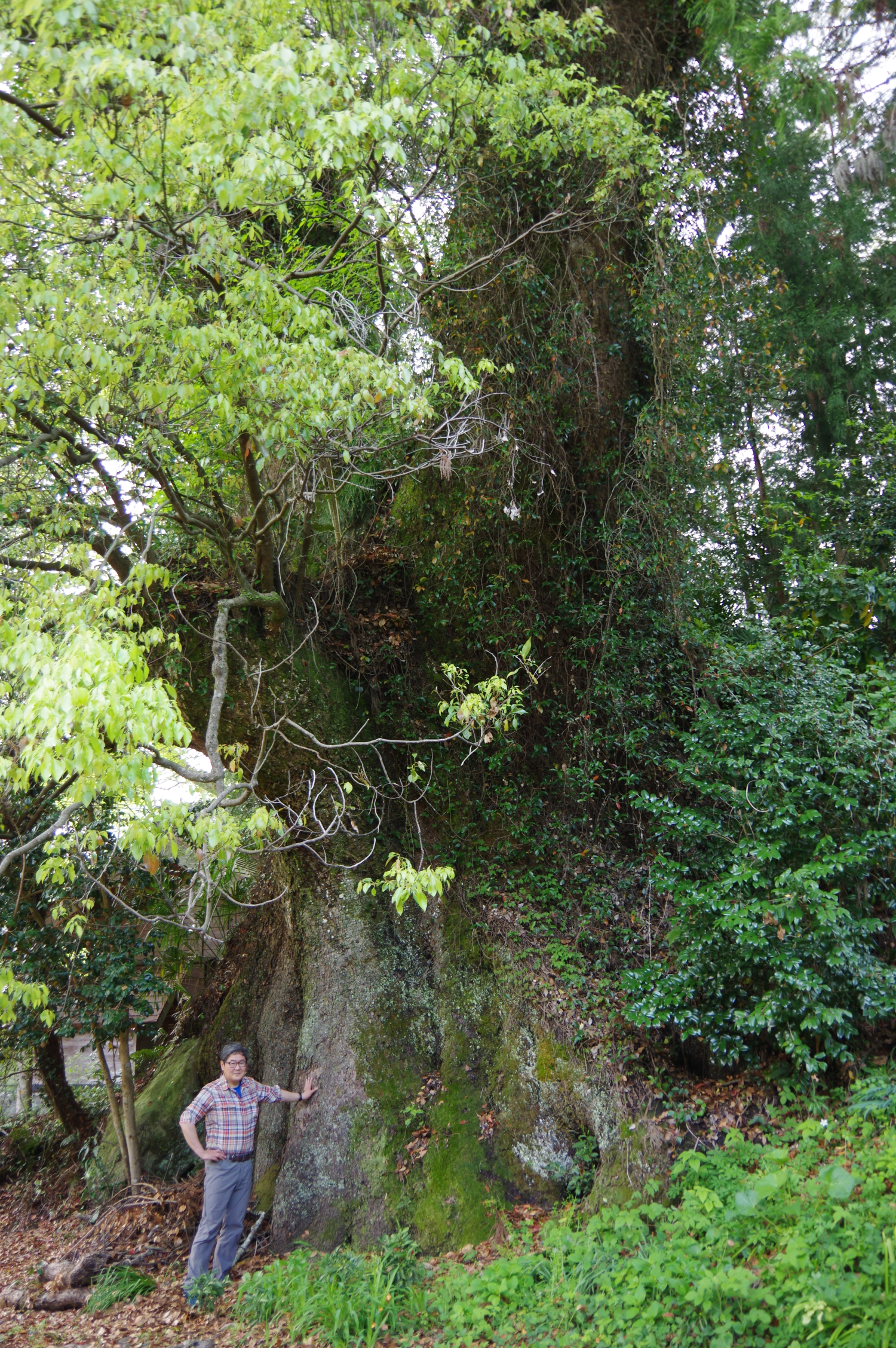静岡市北部の農村地帯、郷島地区の氏神である浅間神社社殿背後に立つ大クス。ツタに覆われて全容がわかりづらいが、根元は巨大で、上部から2本の支幹に分かれて天高く樹冠を展開している。あまり知られていないものの、静岡県内でも屈指のクスノキであろう。樹勢は大きな損傷もなく、良好である。もしかすると神社自体も、このクスを祀って建てられたのかもしれない。