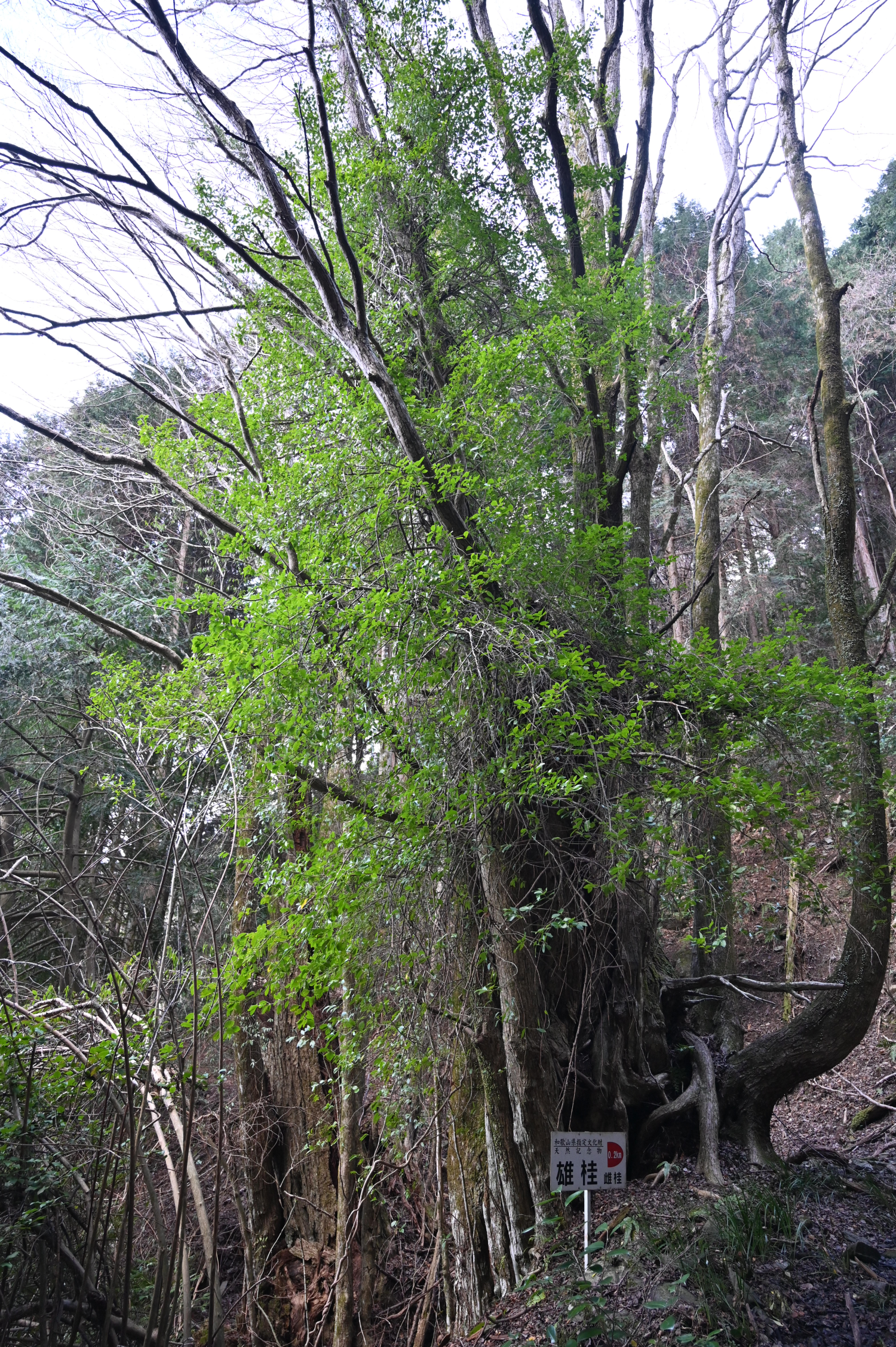 通称・桂の谷にある2株のカツラ巨樹のうち、西にある方で、雄桂と呼ばれている。両樹は300mほど離れて立っている。雌桂同様、本樹も株立ちで、大きく2つの束に分かれ、その中心は朽ち果てて虚ろになっている。叢生した支幹の樹勢はまずまず安定。雌桂と違って、その姿は山陰に隠れて麓からは見えない。