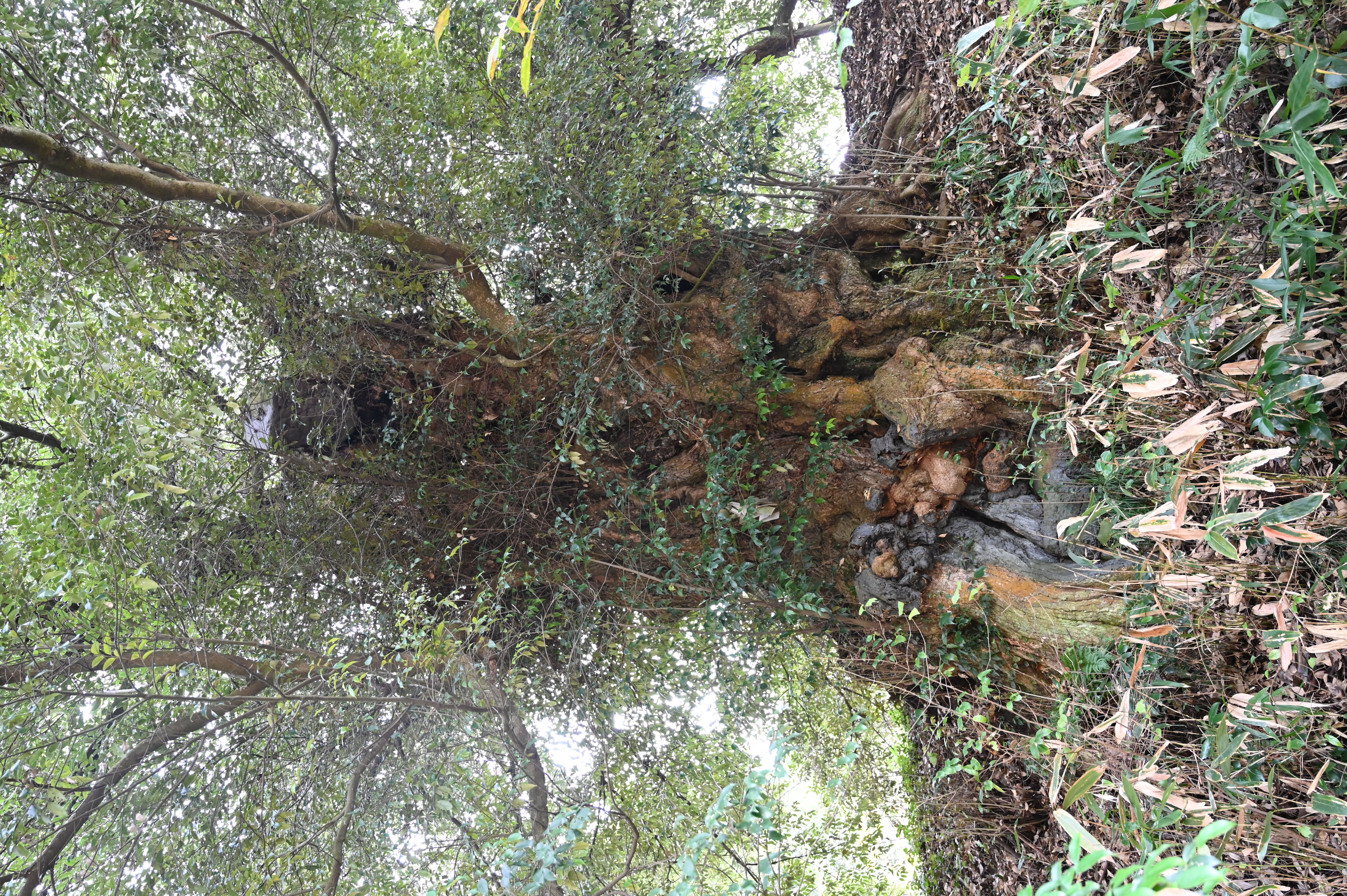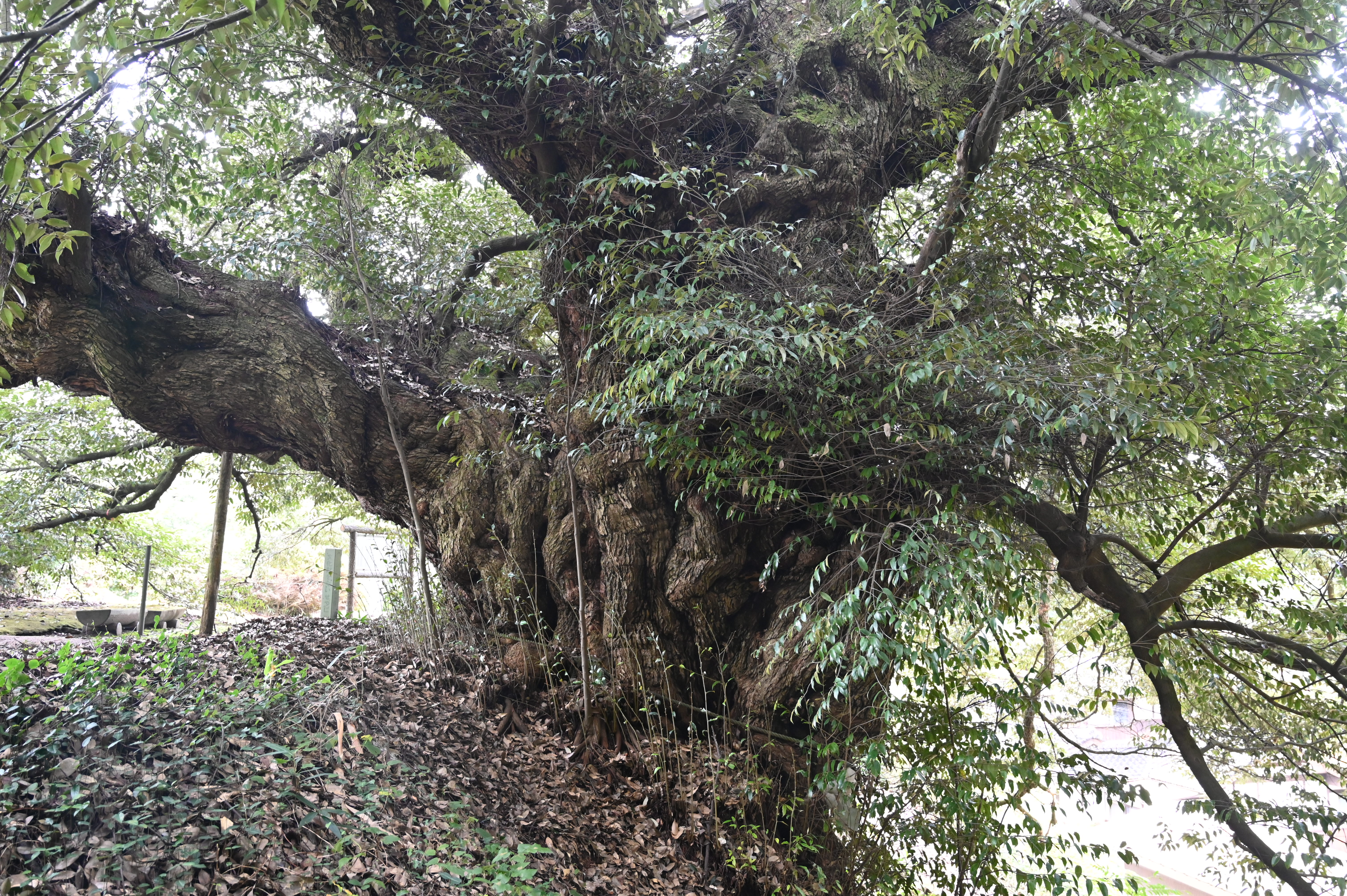 宮場集落の北の外れ、春日神社の参道途中の崖際に立つ同社の御神木。全国有数のシイの巨樹として昭和12年(1937)に国の天然記念物の指定を受けている。高地面から2m付近で三本の大枝に分かれ、上部よりむしろ左右に向かって扁平に樹冠を広げて、鬱蒼と茂っている。根元は太く巌のようであるが、近年になってひこばえが多く生じて、ややごちゃごちゃした印象を与える。枯損した枝は一部見受けられるものの、全体としておおむね樹勢は良好。山陰地方はスダジイの適地で多くの巨樹が集中するが、その中でも代表的な一本であろう。