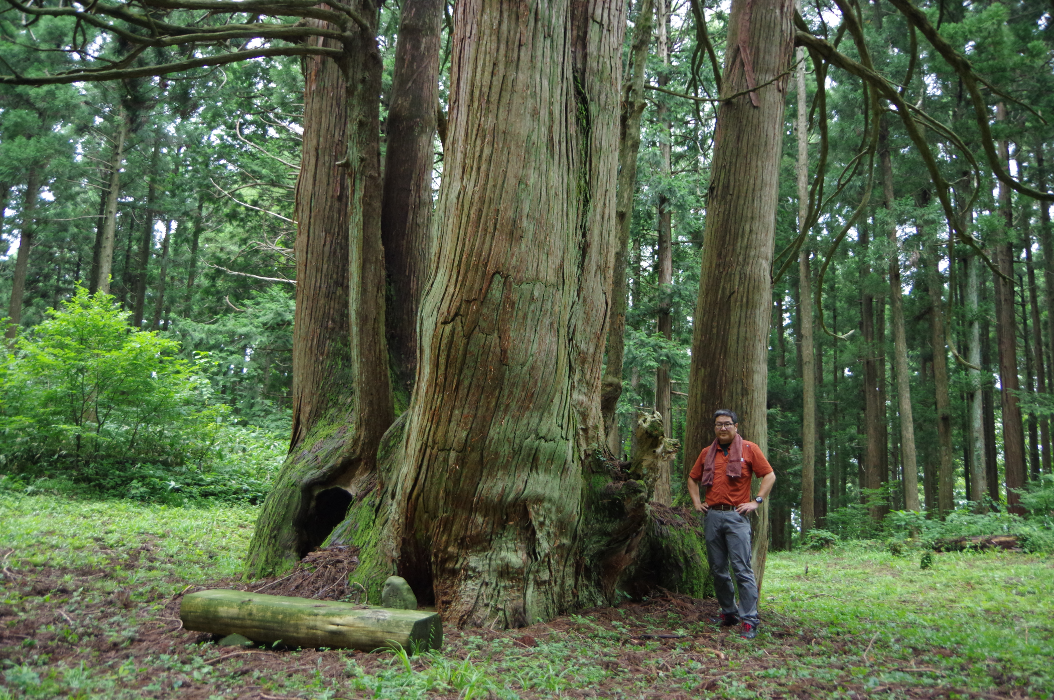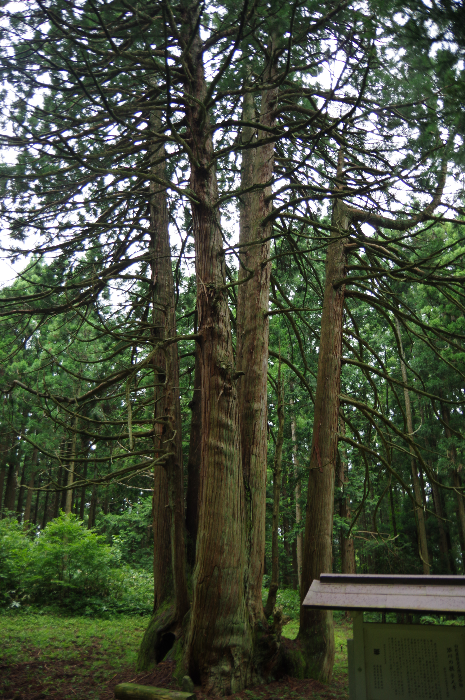 羽黒山の北、田園地帯に続くなだらかな里山の植林地内にあるスギの怪樹。株立だが根は一つに繋がっており、現在みられる多数の幹は、もとあった親木が大風等によって倒れた後に叢生したひこばえが成長したものとも考えられる。根元には祠が祀られており、山の神の依り代として、昔より里人に大切にされてきたものであろう。一部、支幹の折損はあるが、全体として樹勢は悪くない。