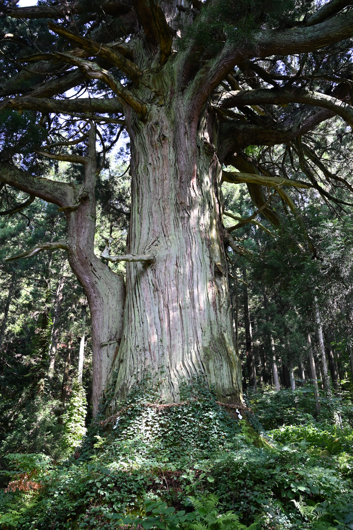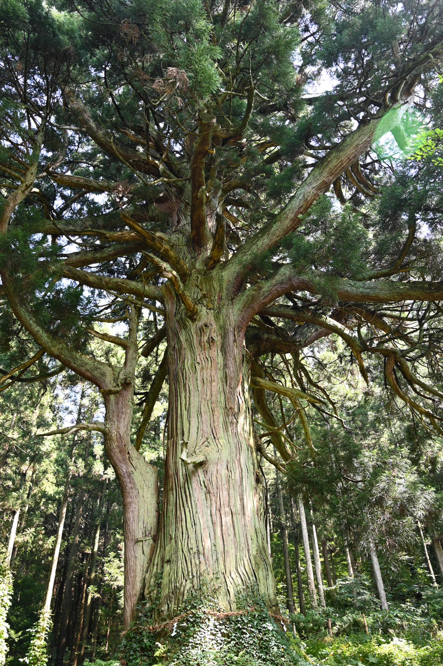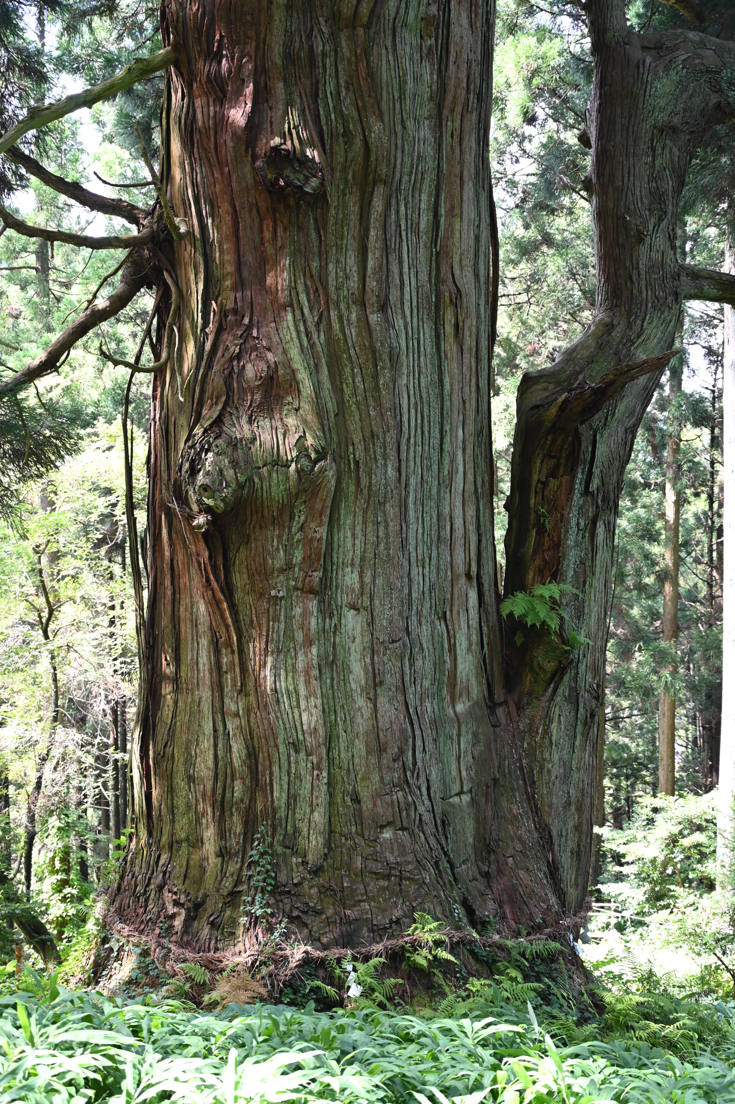 山五十川集落の背後、小高い山の中腹に熊野神社があり、その境内に聳えている。同じ鶴岡市の「熊野神社の大スギ」とともに、山形県を代表するスギ巨樹の一本。幹回りはほぼ同大だが、本樹の方は根元近くから側枝が出て、その分数値を稼いでおり、そのすっきりとした主幹の様子や樹の活力から見ても、「熊野神社の大スギ」よりは少し後輩であろうか。その勢いは、隣にあった社殿を年々傾かせていたほどで、近年、本樹の保護の目的もあって、社殿は百mほど離れて移築されている。地元による適切な管理がなされ、今も樹勢は良好である。
