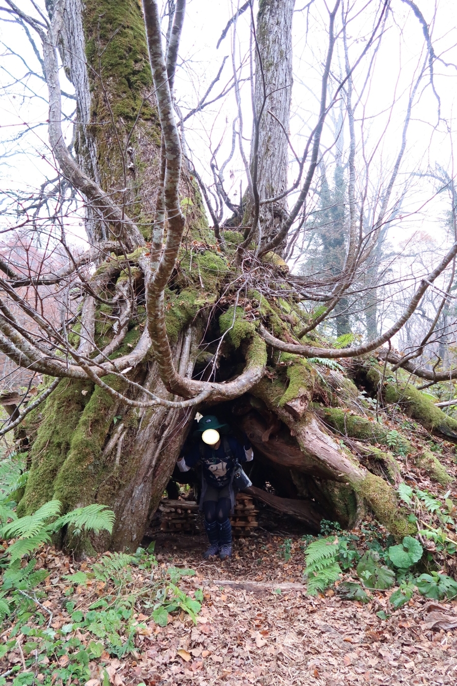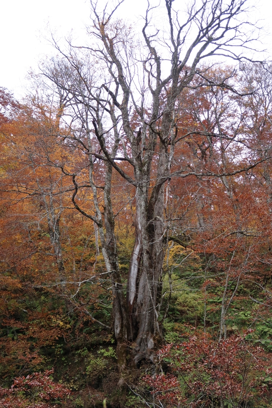 籾糠山へ紅葉を見にグループ登山に来ました。 一帯は、天生県立自然公園に指定されていて、湿地や巨木林があります。 紅葉が綺麗です。 駐車場から山道を登り、天生湿原を過ぎて、登山道が3つに分かれるところに、桂の巨木が1本。幹回り1140cm、樹高35m。ひこばえがたくさん生えていて、その分太くなっています。根元に人が入れる空洞があります。 中央の道を進むと、桂の門と名付けられた5本の巨木が横に並んでます。圧巻の風景。その先にも登山道脇に4本、川の対岸にも3本桂の巨木がありました。 根上して空洞のある木、ひこばえ